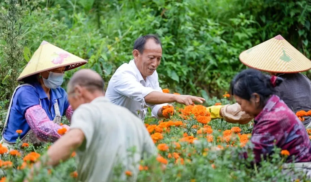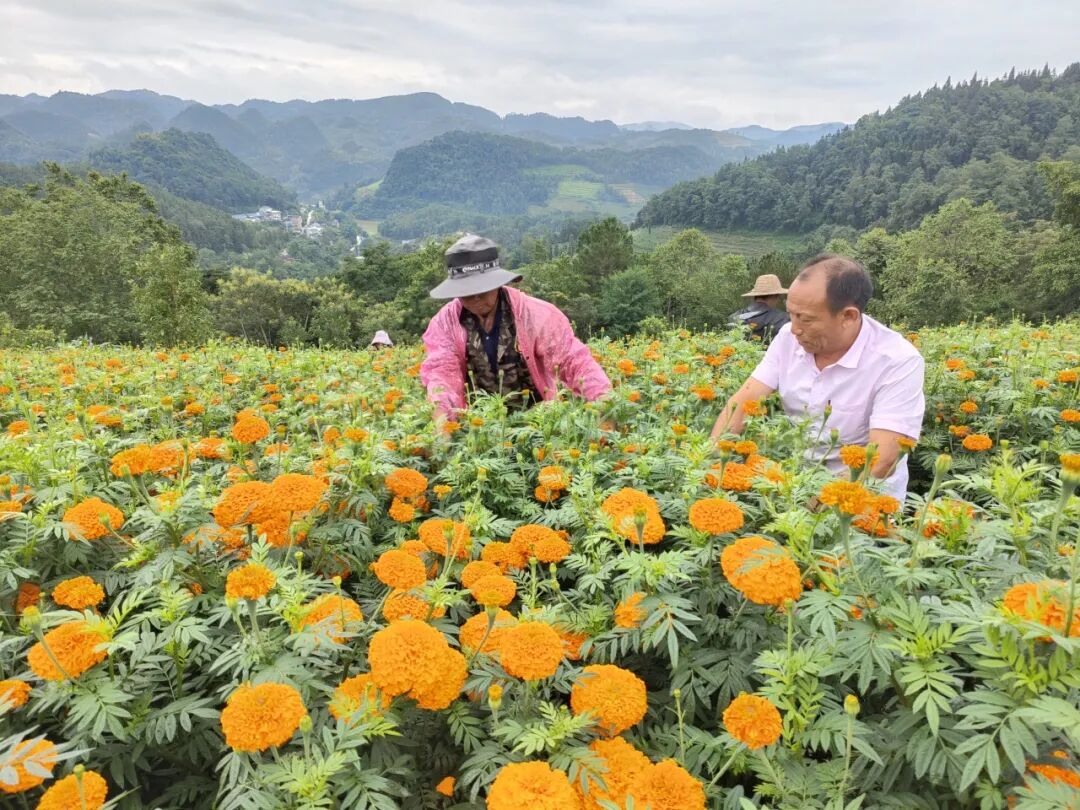 面对质疑,刘丕荣在笔记本上反复演算:种子成本、肥料费用、人工开支、企业保底收购价,即便遭遇自然灾害,农户能够保障的保底收益……一笔一笔清晰列明。在群众会上,他将写满数据的账本摊在众人面前,语气坚定又诚恳:“乡亲们,咱们大胆试一试!我已经对接好龙头企业,签订了订单收购协议,技术有专人上门指导,销路由企业全权负责。万一出现亏损,我先担着!”一句“我先担着”,彻底打消了村民的所有顾虑。2022年4月,第一粒万寿菊种子被细心播撒进拉孩村的梯田,也种下了乡亲们对美好生活的崭新期盼。