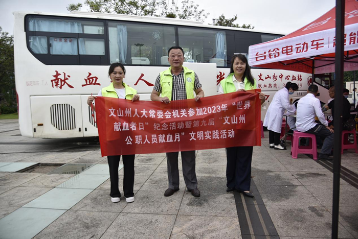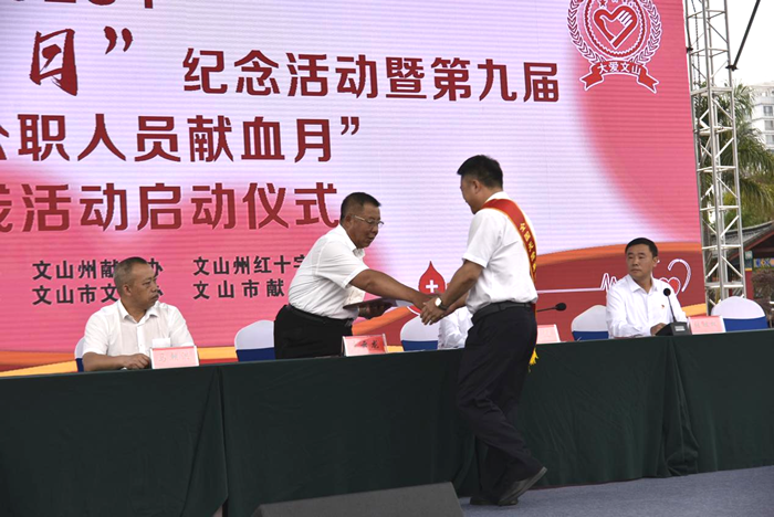 6月14日,文山城区2023年“世界献血者日”纪念活动暨第九届“文山州公职人员献血月”文明实践活动启动仪式在七花广场举行。州人大常委会副主任李云龙出席启动仪式并为2020—2021年度全国无偿献血奉献奖、无偿献血志愿服务奖、无偿献血促进奖、无偿捐献造血干细胞奉献奖获得者颁奖。